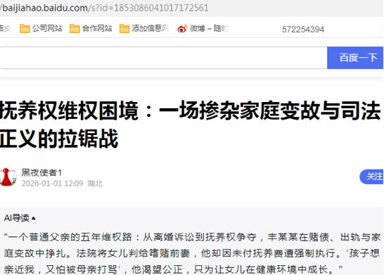 抚养权维权困境:一场掺杂家庭变故与司法争议的拉锯战2025年年底,丰某某这位常年在扬州务工的普通农村汉子,自2020年与前妻李某某开启离婚诉讼后,便陷入了抚养权与抚养费的双重困境中,加之家庭接连遭遇的变故,让他的维权之路布满荆棘。丰某某与李某某的婚姻,在他看来早已因对方的行为失去了存续的基础。在2020年3月提交的诉讼请求中,丰某某详细罗列了李某某的多项问题:她嗜赌如命,自嫁入丰家后便常年参与麻将赌博,动辄上千块的输赢在当地已成常态,丰某某在外打工的收入,不少都被用来为其偿还赌债,甚至2020年疫情严峻的2月23日,李某某仍聚众赌博,丰某某当场抓赌并在杨郢乡派出所报警,留有出警记录与现场视频为证。丰某某还指出李某某存在婚内出轨行为,在其外出务工期间与多名男性有染,甚至曾偷偷前往南京打掉非婚孩子,手机中保留的视频、图片以及微信聊天记录,都成为他手中的证据,李某某腹部的手术疤痕也可现场对质。李某某不仅无正当职业、好吃懒做,对女儿的抚养也未尽到应有的责任。他表示,李某某因沉迷麻将,常常不做饭而带孩子去饭店就餐,接送孩子上学更是毫无规律,导致孩子频繁迟到早退,养成了不良的生活与学习习惯,这些情况均可向孩子就读的学校老师核实。更让丰某某担忧的是,孩子外公存在酒驾、持刀伤害妻子的犯罪记录,还有喝农药自杀未遂的行为,其酒后的暴力倾向,让他坚决反对女儿被寄养在外公家中。丰某某在离婚诉讼中明确表示同意离婚,但强烈请求法院将女儿的抚养权判给自己。他称自己在扬州工厂有稳定工作与收入,父母年届五十、身体健康,能够帮忙照料孩子的日常生活与学业,自己也可回乡就近工作,陪伴女儿成长。然而,这场抚养权诉讼的结果并未如他所愿,女儿最终被判给了李某某,这成为丰某某心中难以释怀的结。法官没有询问孩子的真实意愿,就轻率的判给女方抚养,判决不公。表姐曾建议他拒绝支付抚养费,可签字后又被告知“孩子是自己的,不能不给”,这种前后矛盾的说法让他倍感困惑,甚至质疑表姐、表姐夫的教师资格证并非凭真才实学获得。而他因两年未支付抚养费,遭遇了法院的强制执行:工作人员前往其工作的工厂,冻结了他的银行卡,直至抚养费缴纳完毕才予以解冻。更让他气愤的是,他支付的抚养费并未真正用于女儿的成长,反而被孩子外公拿去购置了小汽车,这让他觉得自己的付出成了他人的“便利”。丰某某的父亲是瓦匠,工作时摔断了腿,后来骑电瓶三轮车又被小轿车撞伤,险些丧命,2025年还接受了手术;奶奶也曾突发大病,几经抢救才脱离危险;母亲则莫名无法走路,这些变故都被丰某某归咎于这场抚养权纠纷带来的精神压力。他坦言,自己曾在家中消沉了三个多月,什么事都做不了,花了好几年时间才从痛苦中稍稍走出来。丰某某仍在为女儿的抚养权奔走,他看着手机里女儿穿红衣服站着吃饭的画面,满心酸楚——孩子想亲近自己,却又害怕被母亲打骂。他觉得自己的诉求未被重视,这场维权不仅是为了争取女儿的抚养权,更是为了讨一个公道。他希望媒体能关注到自己的遭遇,让这场掺杂着家庭变故与司法争议的纠纷,能得到公正的审视,让他有机会弥补对女儿的陪伴,让女儿在更健康的环境中成长。
